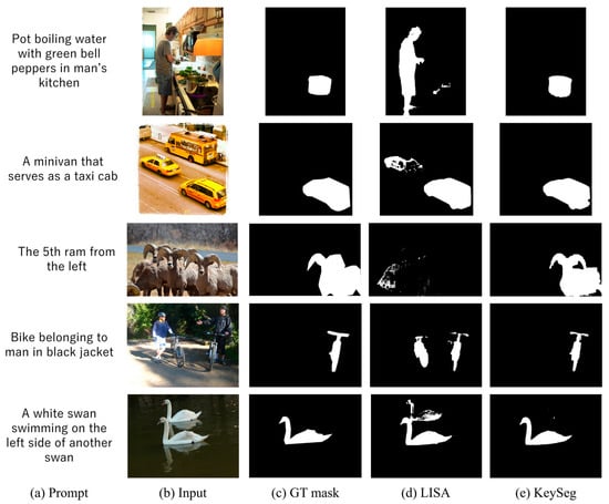 Furthermore, situations in which complex background elements overlap with the main object or similar shapes in the background interfere with object identification (e.g., the kitchen scene in the first row and the swan and water reflection in the last row), highlighting the critical role of a model’s representational power in terms of segmentation boundary consistency and accuracy. KeySeg effectively suppresses visual interference factors and extracts clear contours of the designated object. Conversely, LISA exhibits a lack of consistency, including either the background around the object or incorrect segmentation of the reflected shapes. This result indicates that a keyword-based refinement structure contributes to condition-centric representation reconstruction beyond simple visual features.