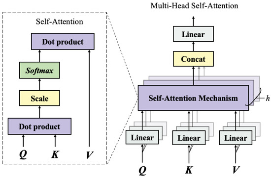 The attention mechanism is inspired by the human visual cognitive process. Its fundamental principle is to rapidly scan the global image, identify and focus on the target regions that require special attention, and allocate more attentional resources to these regions, thereby obtaining richer detailed information and suppressing irrelevant interference. The self-attention mechanism is a specialized form of the attention mechanism primarily used to capture dependencies within the same sequence. However, a single attention head often fails to fully capture the diverse features in the input data. To improve the expressive power of their model, Vaswani et al. [22] proposed the Multi-Head Self-Attention (MHSA) mechanism, as represented in Figure 1.
