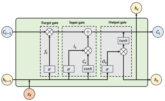 The LSTM network [26] is a specialized variant of the Recurrent Neural Network (RNN). By incorporating a gating mechanism, the LSTM network dynamically adjusts the memory state. This mechanism facilitates the effective transfer of information from previous time steps to subsequent units, resolving the issue of long-term dependencies in sequential data. Furthermore, LSTM effectively mitigates the common problems of vanishing and exploding gradients in RNNs, providing robust support for the modeling of long sequential data. As shown in Figure 2, the framework of LSTM primarily consists of three gating units: the forget gate (), the input gate (), and the output gate ().