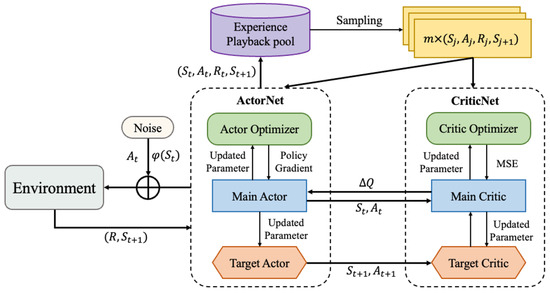 The Deep Deterministic Policy Gradient (DDPG) method adopted in this study is an extension of the Actor–Critic framework specifically designed for continuous action spaces. The network architecture of DDPG primarily consists of three modules: the actor network (policy network), the critic network (value network), and the target network (employed to stabilize training). The detailed architecture and interaction logic of DDPG are illustrated in Figure 3.