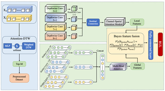 The extraction of features from local and long-term degradation trends in the ADAPT-RULNet structure is mainly achieved through an attention-enhanced multi-scale hybrid RUL prediction network based on Bayesian fusion, as illustrated in Figure 5.