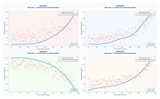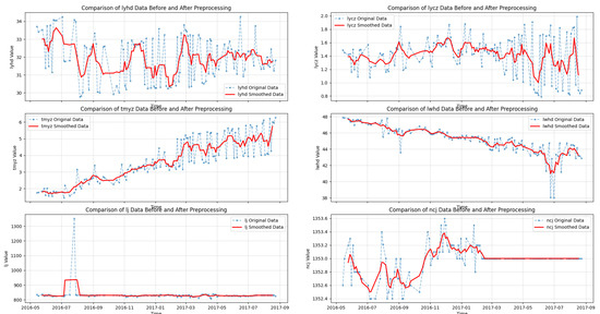 Therefore, it is necessary to perform Functional Adaptive Regression (FAR) initialization on the raw data. Subsequently, six sensors that reflect the wear evolution patterns were identified, including left wheel thickness (lyhd), left wheel tread-wear depth (lycz), rim wear (tmyz), wheel-axle diameter parameter (lwhd), mileage data (lj), and inner measurement value (ncj). These parameters comprehensively characterize the wear evolution of wheel-axle components under actual operating conditions. The preprocessing results of the wheel dataset are illustrated in Figure 14, which shows that FAR effectively eliminates high-frequency noise, mitigates localized fluctuations, and enhances the consistency of time-series signals.