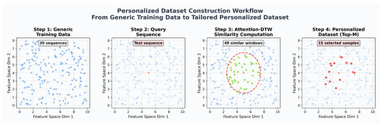 As illustrated in Figure 7, the construction process of the personalized dataset includes the following steps: Step 1—raw sequences are extracted from the general training set and mapped to a two-dimensional feature space for visualization; Step 2—a test sequence of length M is input as the query object; Step 3—the candidate windows most similar to the test sequence are screened from the training set through Attention-DTW similarity calculation; Step —the top M samples are selected based on similarity ranking to form the personalized dataset, thereby providing a more reliable data foundation for degradation trend analysis.