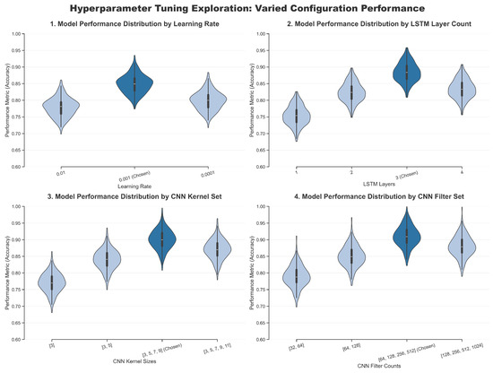 During hyperparameter selection, comparative experiments were conducted on the learning rate, the number of LSTM layers, the kernel sizes of the CNN, and the number of filters. Multiple experiments were performed to evaluate their impact on RUL prediction accuracy, and the most suitable hyperparameters were identified accordingly. The comparative results are shown in Figure 8, where the violin-shaped regions represent kernel density estimates, the black lines indicate the upper and lower bounds after removing outliers, the horizontal lines denote the medians, and the white dots represent outliers. As illustrated in the figure, the highest prediction accuracy is achieved when the learning rate is 0.001, the number of LSTM layers is 3, the CNN kernel sizes are [3, 5, 7, 9], and the CNN filter counts are [64, 128, 256, 512].