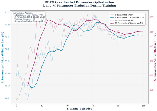 The convergence analysis in the upper-left corner indicates that ultimately converges to 75.3 and converges to 150.1, with the optimization state marked as “Converged”. During initial training, the raw values of and exhibit significant fluctuations, reflecting the active exploration of parameter adjustments. As training progresses, the moving-average curves gradually smooth out and stabilize in the mid-to-late stages, validating the effective optimization and convergence process of the DDPG algorithm.