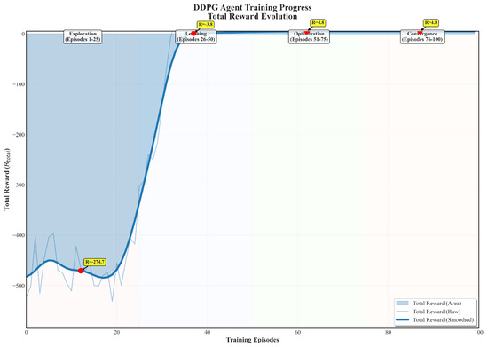 Figure 10 illustrates the evolution of the total reward of the RUL prediction model based on the DDPG algorithm over 100 training episodes. As shown in the figure, the agent’s learning process undergoes four distinct stages: an initial exploration phase characterized by low and highly fluctuating rewards; a subsequent learning and optimization phase with gradually increasing rewards; and, finally, a convergence phase where stable, high-performance rewards are achieved. This evolutionary trend confirms that the DDPG algorithm can effectively learn the optimal strategy for adaptively adjusting the time-window length () and the dataset size (), thereby achieving a dynamic balance between model complexity and prediction accuracy.