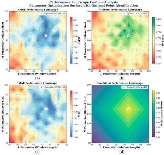 Figure 11 presents a contour analysis of model performance distribution based on the combinations of and , including four subplots for RMSE, Score, MAE, and comprehensive performance. In each subplot, the values of are plotted along the horizontal axis, whereas the values of are plotted along the vertical axis. The color gradient and contour lines visualize the performance under different parameter combinations, where cool tones (e.g., blue) indicate better performance and warm tones (e.g., red) indicate poorer performance.