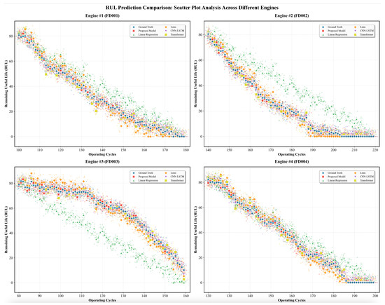 The prediction results of ADAPT-RULNet on the C-MAPSS dataset are shown in Figure 12. The ADAPT-RULNet model demonstrates a better alignment between predicted and observed RUL curves across different subsets of the dataset. Notably, as the actual RUL diminishes—indicating the engine’s approach to failure—the prediction error is markedly reduced, with the majority of the predicted values falling within a reasonable error margin. This indicates the model’s proficiency in accurately identifying significant degradation features during the latter stages of equipment deterioration, particularly within the pivotal prediction window, thereby facilitating precise RUL forecasting.