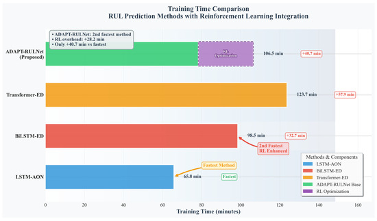 From a horizontal perspective, the evaluation metrics (RMSE, Score, and Accuracy) show a gradual decline across the FD001 to FD004 datasets, reflecting the increased complexity of the dataset under the diversity of operating conditions and fault modes, which brings greater challenges to the prediction task. In a vertical comparative analysis, the ADAPT-RULNet model proposed in this study demonstrates notable competitiveness across all evaluation metrics. Its average RMSE and average Accuracy achieve the best optimal values among existing methods, clearly indicating that the proposed framework surpasses previous solutions with regard to overall prediction accuracy. Furthermore, we investigated the computational performance of the models. As shown in Figure 13, by comparing the computational efficiency of advanced models listed in Table 3, including ADAPT-RULNet, Transformer-ED, BiLSTM-ED, BiGRU-AS, and LSTM-AON, we observed that the proposed method achieves an upper–middle level of efficiency. In addition, further analysis of the neural network component and the reinforcement learning training cost revealed that the efficiency bottleneck of the proposed method primarily lies in the reinforcement learning module. In future work, lightweight architectures and meta-learning strategies will be explored to further enhance the efficiency of the reinforcement learning component. Although further performance improvements might be attainable through a more extensive hyperparameter search and more efficient and accurate data preprocessing, the proposed and validated RUL prediction framework, which integrates attention mechanisms and DRL, leverages its adaptive advantages to effectively address the inherent limitations of traditional deep learning methods in handling heterogeneous sensor data and complex operating condition failure patterns. This not only provides an effective approach to reducing prediction inaccuracies but also offers practical references for researchers in hyperparameter optimization.