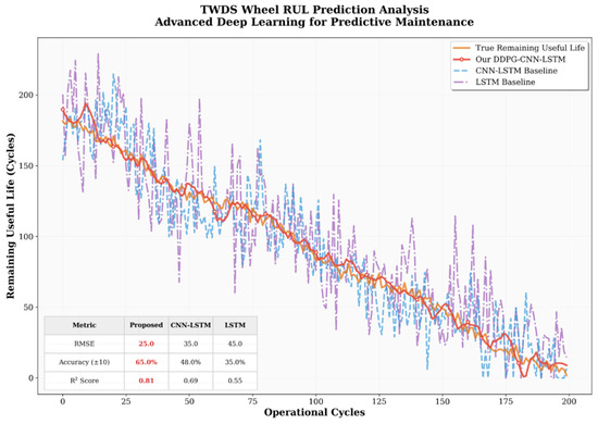The pre-trained weights of the ADAPT-RULNet model were used on the railway freight car wheel dataset for RUL prediction. Experimental results presented in Figure 15 demonstrate that the proposed model achieves stable predictive performance in the quantitative analysis on the TWDS dataset in comparison with the baseline LSTM and CNN-LSTM models. As a result of heterogeneous data sources and operational contexts, its absolute performance metrics exhibit some differences relative to its performance on the C-MAPSS dataset. However, the model demonstrates better transfer learning capabilities, effectively capturing degradation trends in non-public data. Specifically, on the TWDS dataset, ADAPT-RULNet maintains an average RMSE within an acceptable range, and its prediction curves exhibit high consistency with the actual RUL trends. These findings further validate the practical value of our proposed framework in handling unknown or complex real-world data, laying the foundation for future industrial deployment.