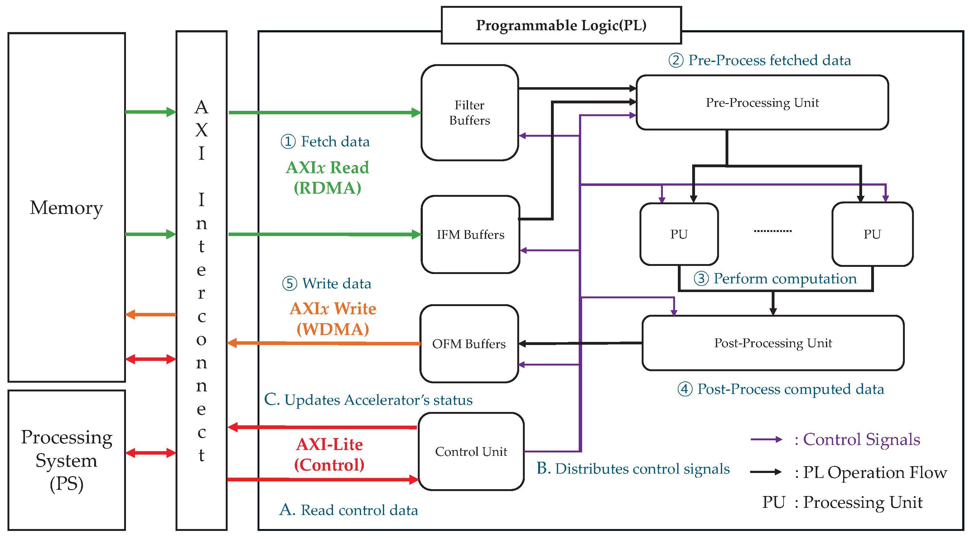 - A Via AXI-Lite, the PS sends control data—such as current layer information, target memory addresses for each buffer’s DMA operation, and accelerator status—to the control unit.