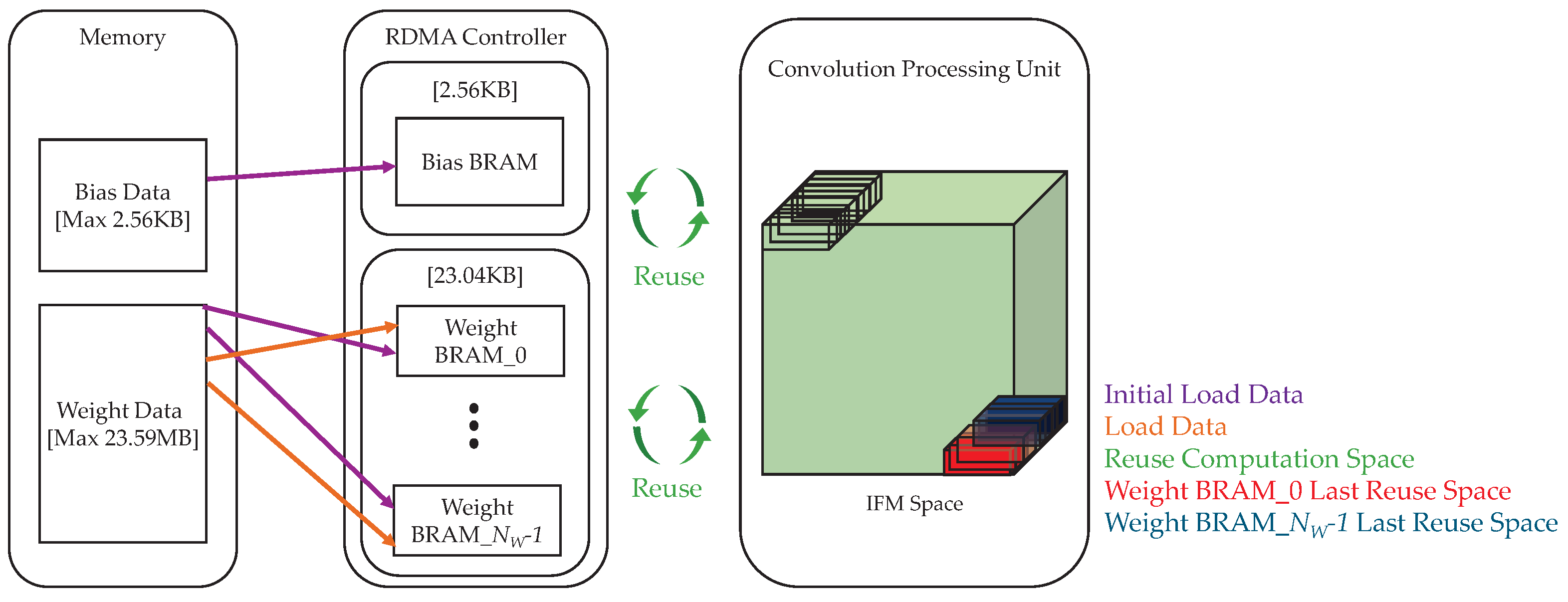 - ① The filter and IFM data stored in the external memory are fetched via read direct memory access (RDMA) over the AXI interconnect and stored in on-chip buffers for reuse and tiling.