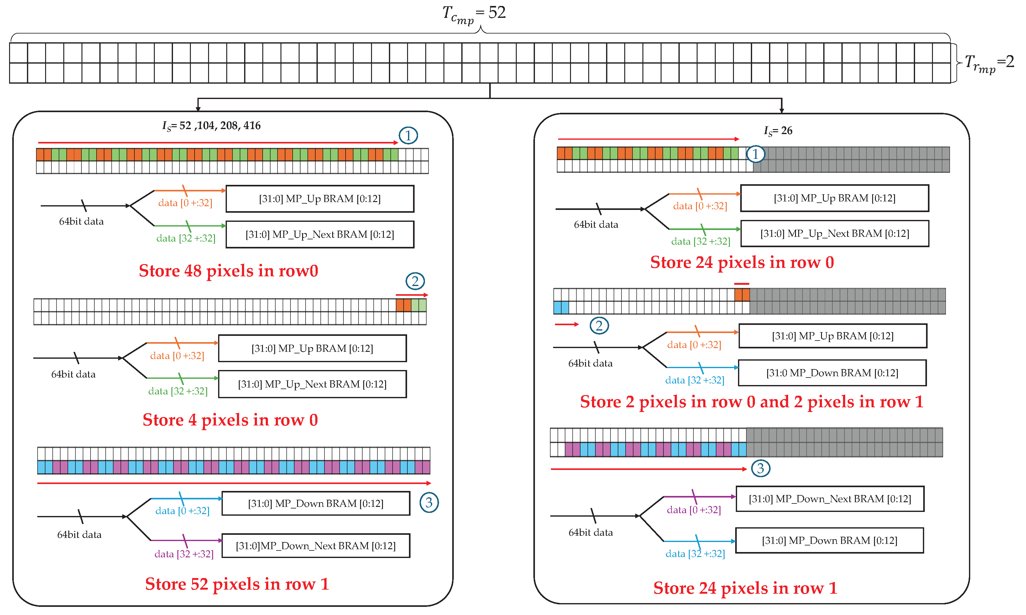 - For , the first two pixels of the following row are stored in the MP_Down BRAM, and the subsequent two pixels are stored in MP_Down_Next BRAM. By contrast, for , the storage order is reversed until the last column of row 1 is filled.