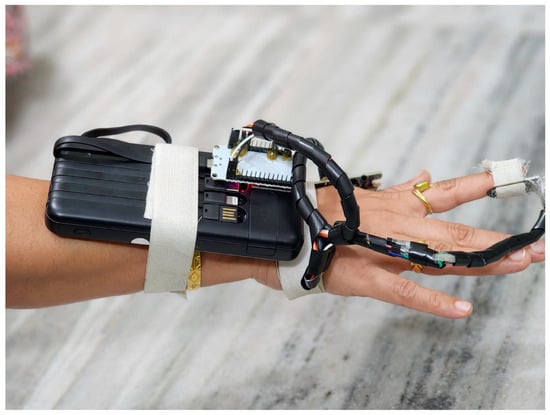 Figure 1 shows a practical implementation of the dual-sensor PPG monitoring system. The device features a wrist-mounted power bank secured with medical-grade Velcro straps that powers an ESP32 microcontroller board. Two PPG sensors are strategically positioned: the MAX86150 sensor on the wrist and the MAX32664 sensor on the fingertip. These are connected via insulated wire bundles protected by spiral cable wraps. This configuration enables the simultaneous measurement of blood flow patterns at two distinct vascular points, capturing both macro- and microvascular dynamics. The white medical-grade Velcro straps ensure stable sensor contact while maintaining user comfort during data collection.