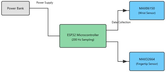 The system employs the following two distinct PPG sensors: a MAX86150 sensor, positioned on the wrist to capture blood flow patterns in larger vessels, and a MAX32664 sensor, located on the fingertip to monitor microvascular circulation. Both sensors are connected to an ESP32 microcontroller, which manages data collection from these dual sensing points. This dual-sensor approach enables the simultaneous measurement of blood flow patterns at different vascular locations, providing complementary data that enhance the system’s ability to distinguish between various flow patterns. The power and data pathways are clearly delineated in the diagram, showing how the power bank supplies energy to the microcontroller, which in turn manages the operation of and data collection from both PPG sensors.