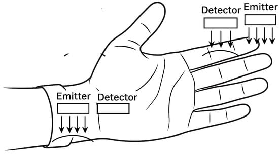 The schematic in Figure 3 illustrates the placement of the photoplethysmography (PPG) sensors, with emitters and detectors arranged on the wrist and fingertip. This configuration enables the simultaneous capture of microvascular and macrovascular blood flow signals, enhancing the spatial richness and diagnostic utility of the recorded data. The dual-sensor placement—on the fingertip and the wrist—was strategically chosen to capture complementary vascular information from both microvascular and macrovascular regions. The fingertip, being rich in capillaries, provides high-resolution PPG signals sensitive to subtle pulsatile changes in peripheral blood flow. In contrast, the wrist region reflects deeper, larger-vessel dynamics that are more representative of systemic circulation. By combining signals from these two anatomically distinct sites, the system captures a more comprehensive representation of blood flow patterns. This dual-site approach enhances the discriminative power of the deep learning model by incorporating diverse physiological features, improving classification accuracy across a wide range of flow types. The selection of these sites also balances signal fidelity and user comfort, making the system suitable for practical, non-invasive monitoring.