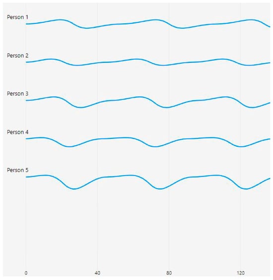 Figure 5 presents photoplethysmography (PPG) waveforms collected from five individuals, labeled as Person 1 to Person 5, each spanning 120 time steps. The waveforms showcase distinct patterns that reflected varying blood flow characteristics among the individuals.