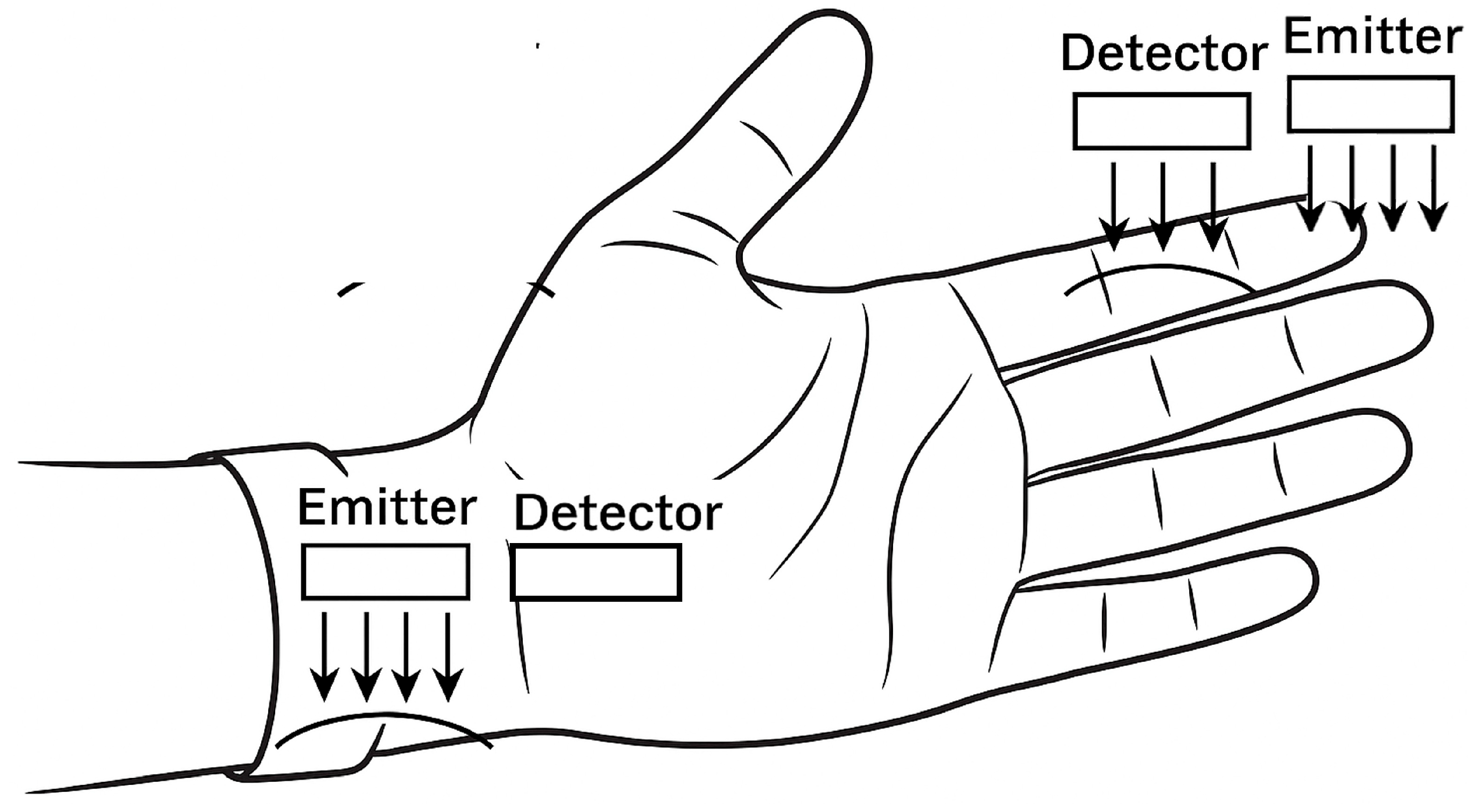 Figure 3 illustrates the placement of the photoplethysmography (PPG) sensors, with emitters and detectors arranged on the wrist and fingertip. This configuration enables the simultaneous capture of microvascular and macrovascular blood flow signals, enhancing the spatial richness and diagnostic utility of the recorded data. The dual-sensor placement—on the fingertip and the wrist—was strategically chosen to capture complementary vascular information from both microvascular and macrovascular regions. The fingertip, being rich in capillaries, provides high-resolution PPG signals sensitive to subtle pulsatile changes in peripheral blood flow. In contrast, the wrist region reflects deeper, larger-vessel dynamics that are more representative of systemic circulation. By combining signals from these two anatomically distinct sites, the system captures a more comprehensive representation of blood flow patterns. This dual-site approach enhances the discriminative power of the deep learning model by incorporating diverse physiological features, improving classification accuracy across a wide range of flow types. The selection of these sites also balances signal fidelity and user comfort, making the system suitable for practical, non-invasive monitoring.