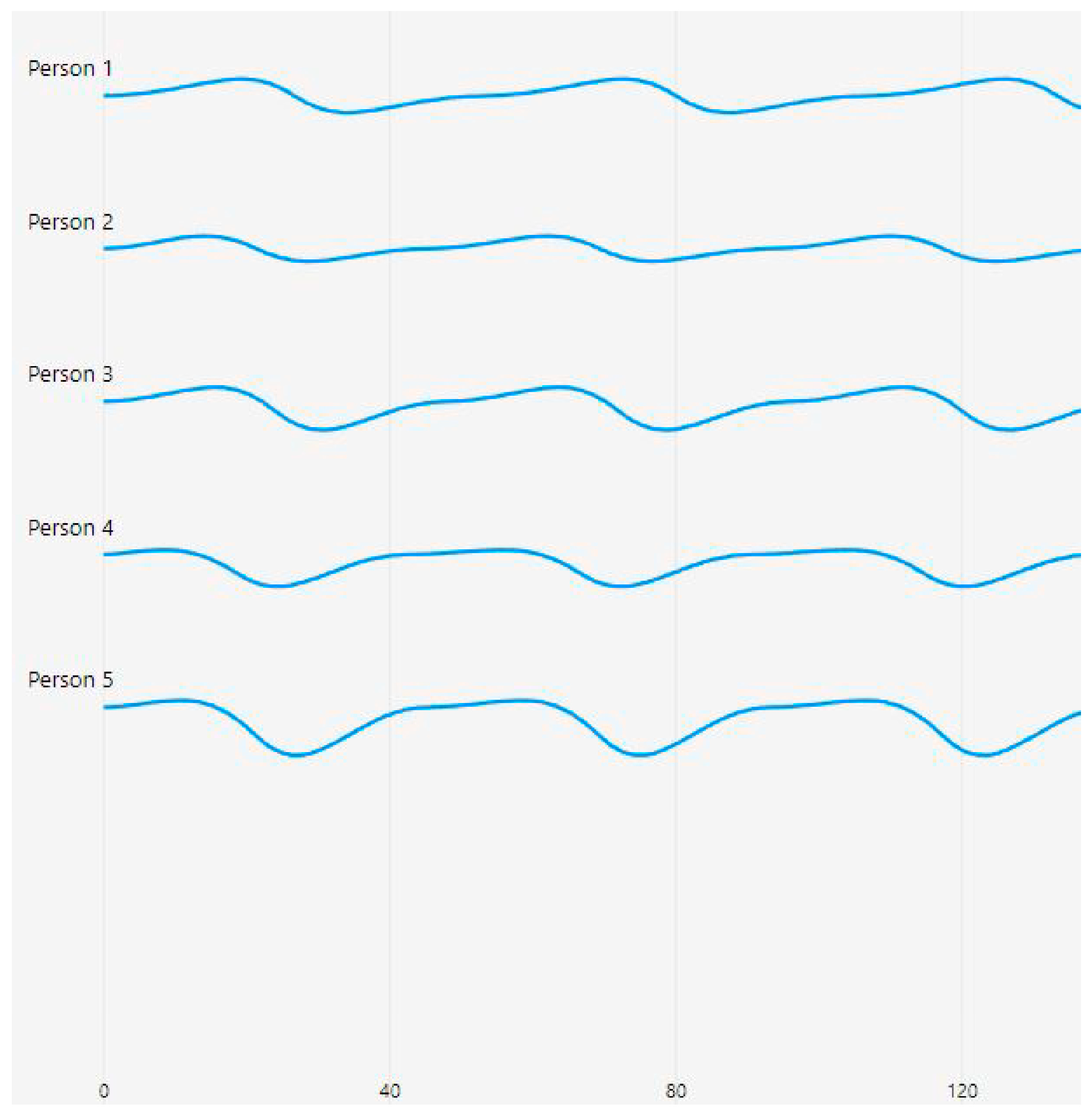 Figure 5 presents photoplethysmography (PPG) waveforms collected from five individuals, labeled as Person 1 to Person 5, each spanning 120 time steps. The waveforms showcase distinct patterns that reflected varying blood flow characteristics among the individuals.