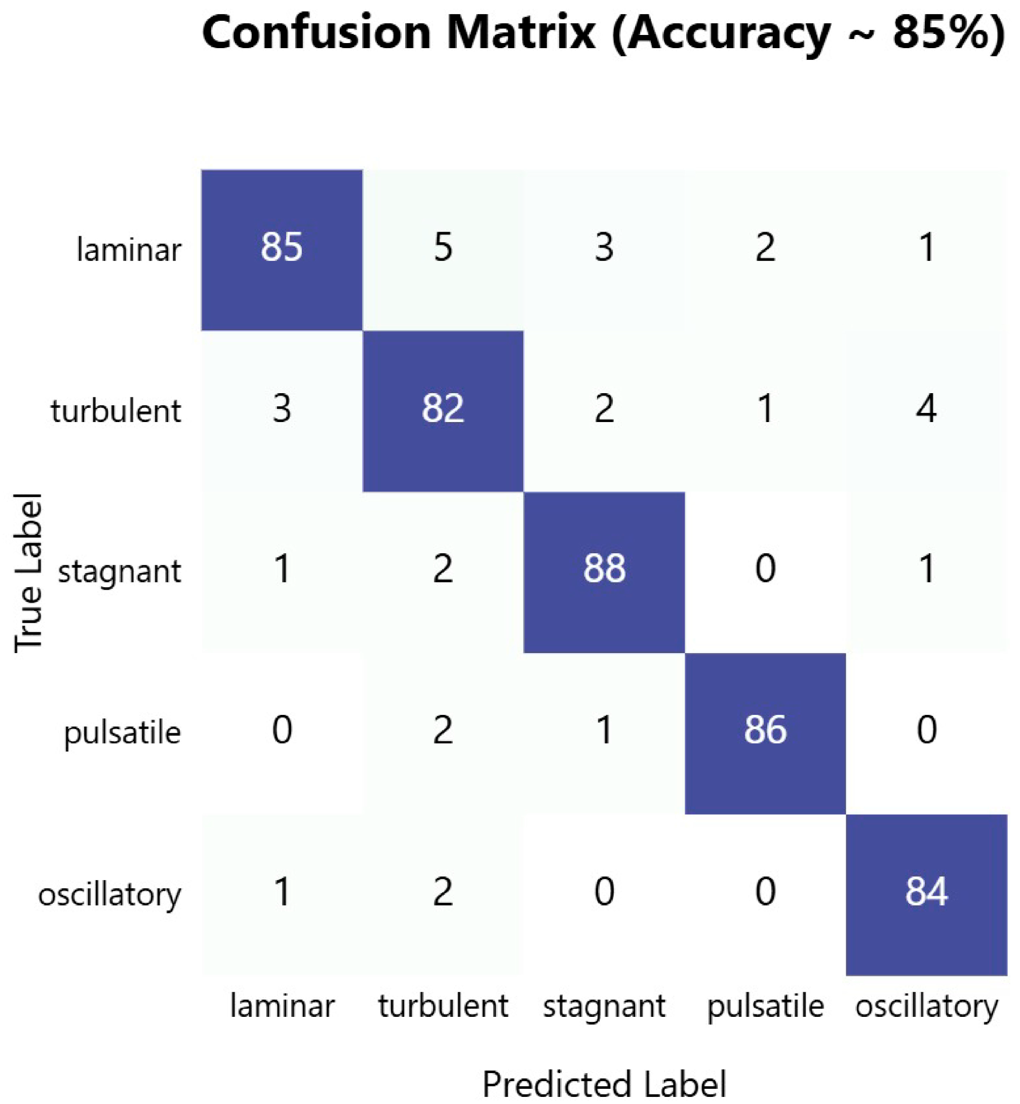 An analysis of misclassifications revealed interesting patterns that aligned with the physical similarities between certain flow types. The most notable confusion occurred between laminar and turbulent flows, with 5% of laminar flows being misclassified as turbulent and 3%of turbulent flows being misclassified as laminar. This confusion was physiologically plausible, given the potential for gradual transitions between these flow states in blood vessels. Notably, the model showed minimal confusion between distinctly different flow patterns, such as between pulsatile and stagnant flows (1%) or between oscillatory and pulsatile flows (1%), indicating the system’s ability to differentiate between fundamentally different flow dynamics. The low off-diagonal values across most categories suggest that when misclassifications occurred, they tended to favor physically similar flow patterns, supporting the model’s ability to capture meaningful physiological characteristics.