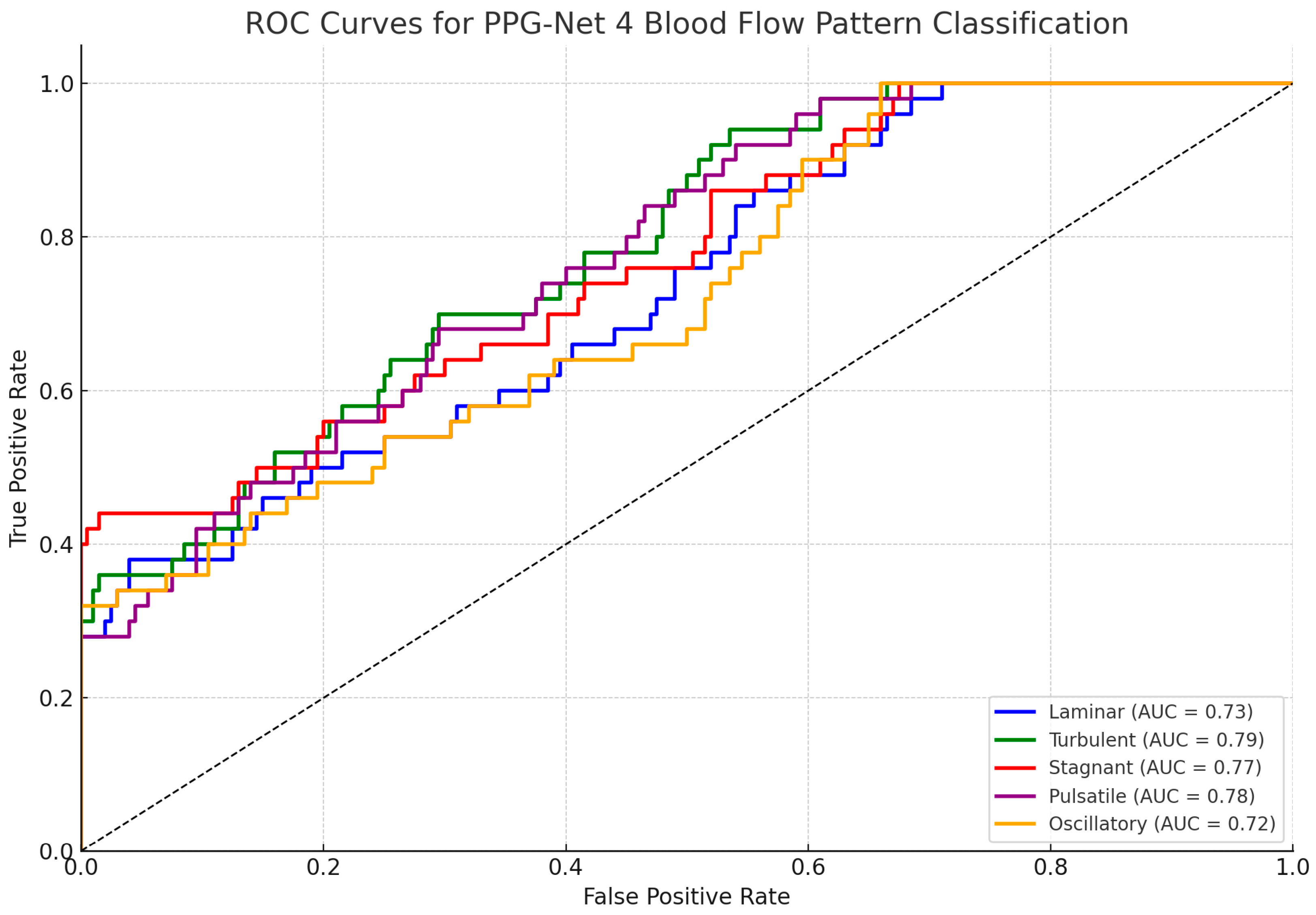 Figure 8 shows the ROC curves for each of the five classified blood flow patterns (laminar, turbulent, stagnant, pulsatile, and oscillatory). The area under the curve (AUC) values, ranging from 0.72 to 0.79, indicate the good but not perfect discriminative performance of the PPG-Net 4 model on the test set. These results reflect the model’s reasonable ability to differentiate between the five flow types while acknowledging the inherent challenges of classifying physiological signals.