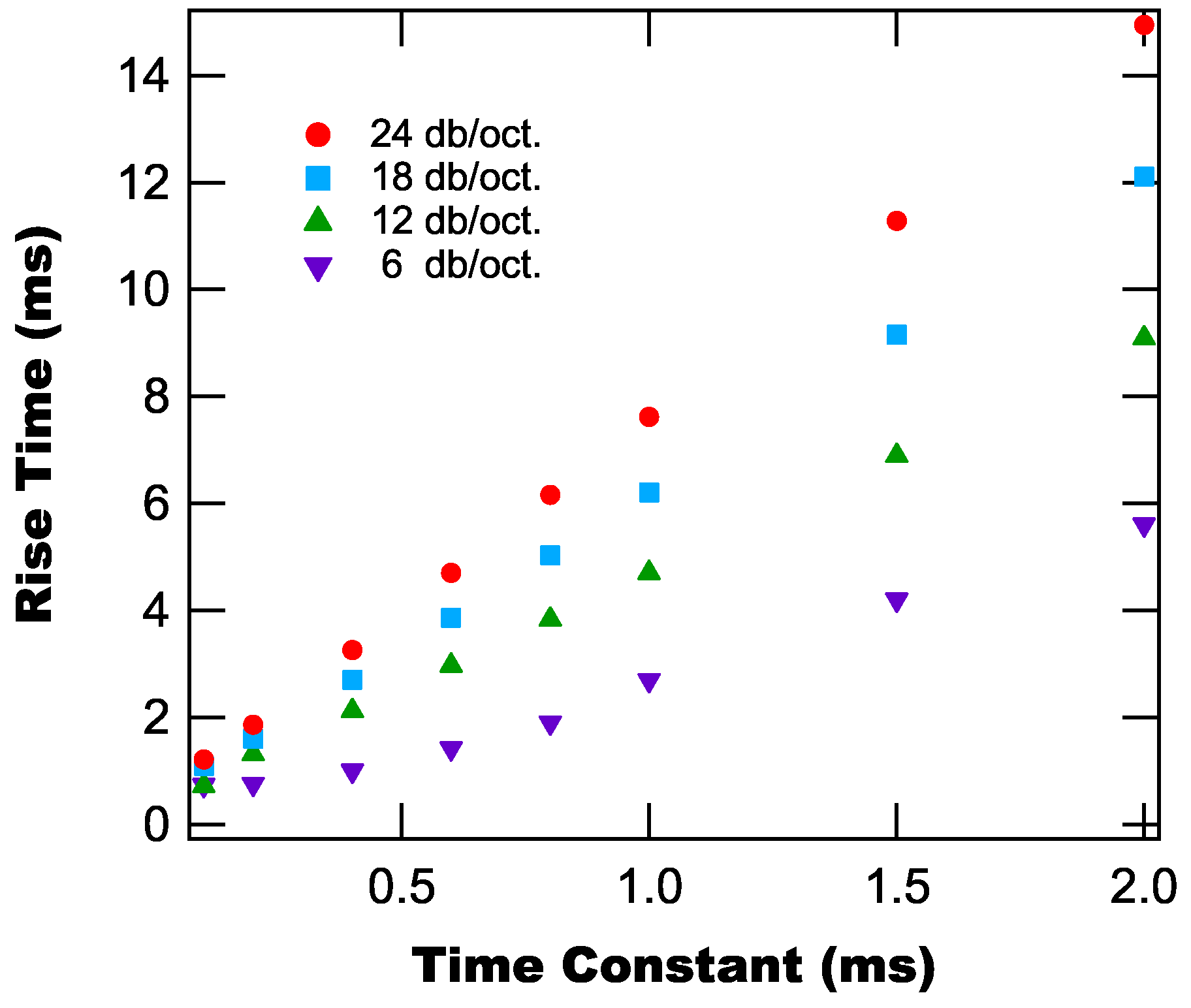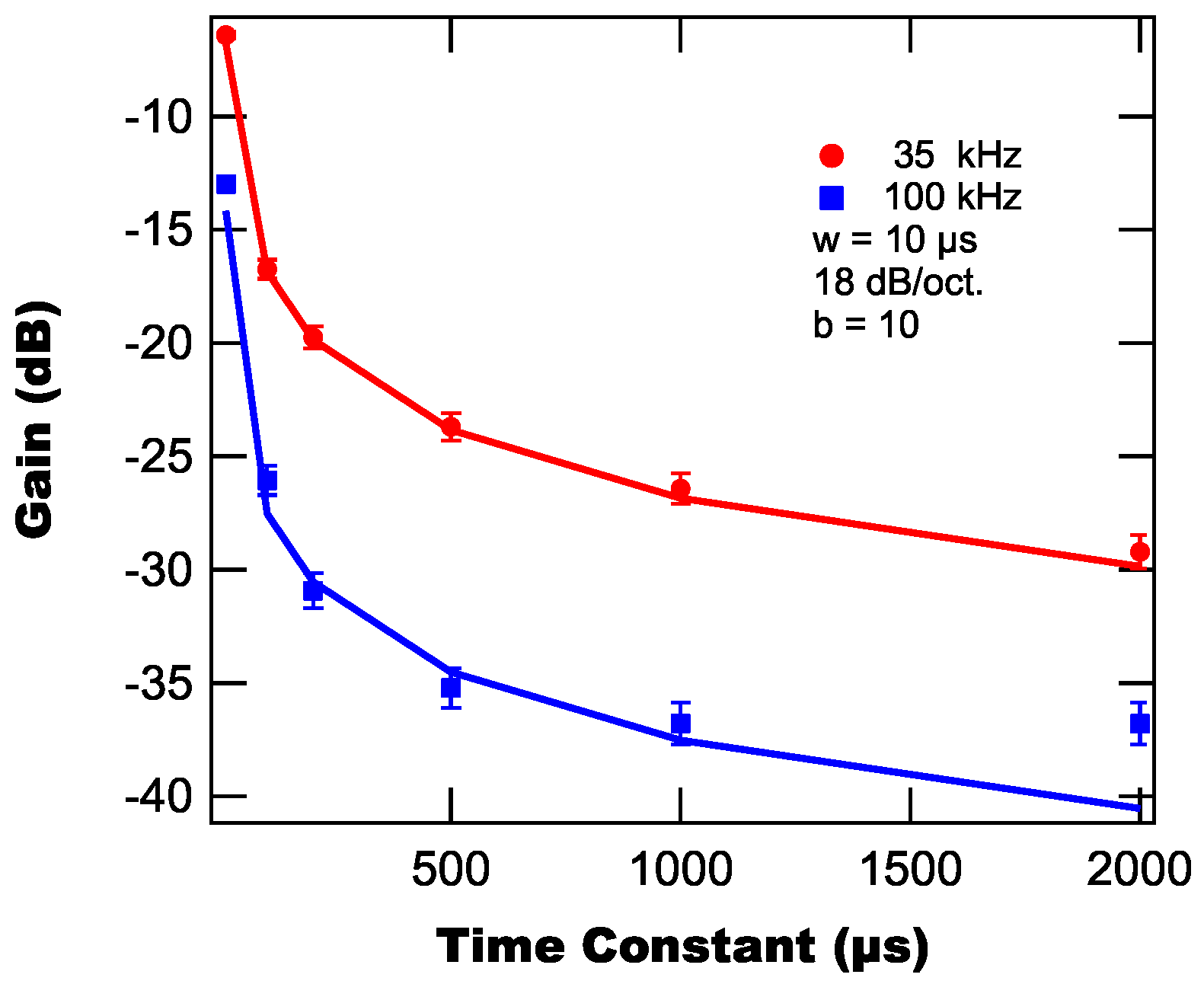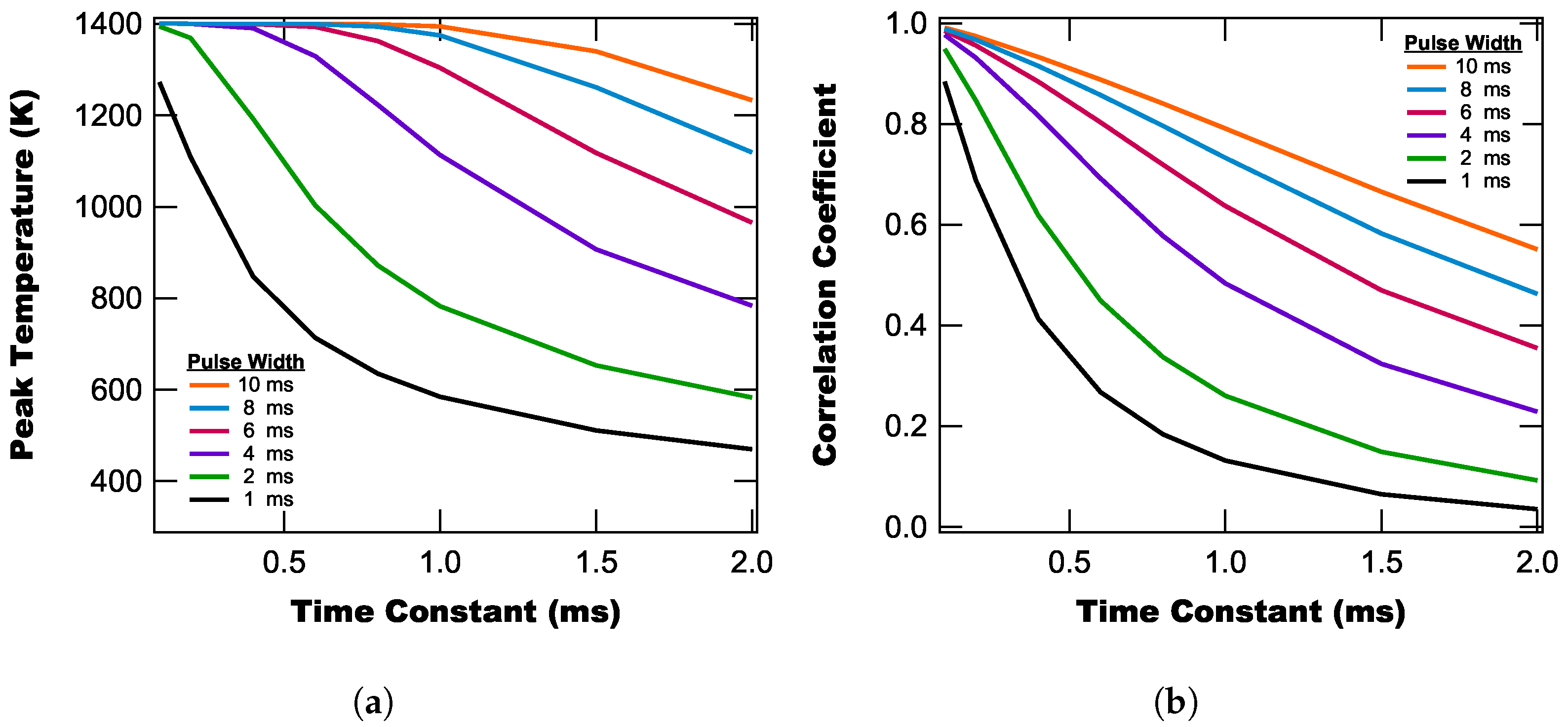 Time Constant | • Increases with time constant, but eventually reaches a point of diminishing returns. | • Rise time is linear in time constant, with the slope dependent on the roll-off. • Correct peak temperature is obtained as long as the pulse width is 10× greater than the time constant. • For shorter pulses the peak temperature decays exponentially with time constant. • Correlation coefficient between actual pulse and reproduced pulse decreases with time constant. |