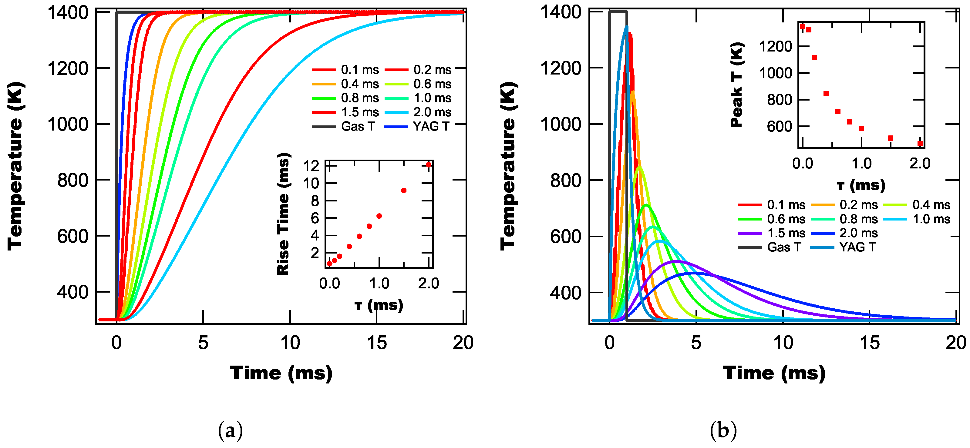 - Jovicic, G.; Zigan, L.; Will, S.; Leipertz, A. Luminescence Properties of the Thermographic Phosphors Dy3+: YAG and Tm3+: YAG for the Application in High Temperature Systems. Z. Phys. Chem. 2015, 229, 977. [Google Scholar] [CrossRef]