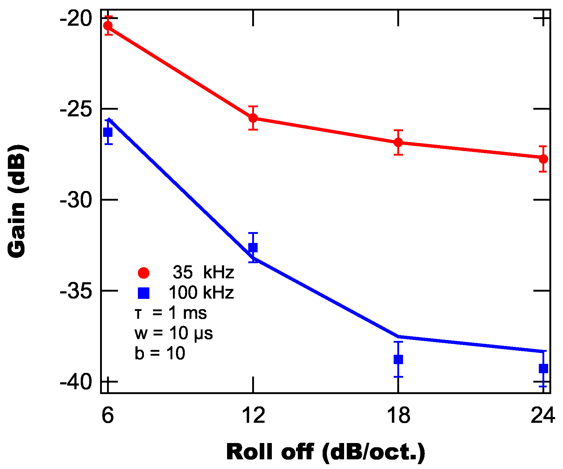 Roll-off | • Significantly increases with roll-off up to 18 dB/oct, after which the increase per step is reduced. | • Rise time is linear in roll off, with the slope dependent on the time constant. • Peak temperature decays exponentially with roll off. |