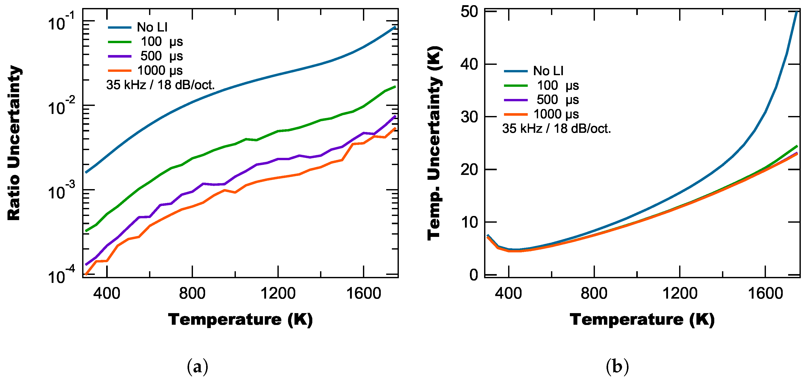 - Hashemi, A.; Jovicic, G.; Batentschuk, M.; Brabec, C.J.; Vetter, A. Contactless temperature determination using dual-channel lock-in phosphor thermometry. Meas. Sci. Technol. 2017, 28, 027001. [Google Scholar] [CrossRef]