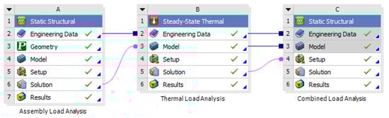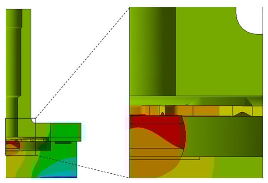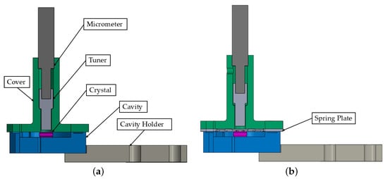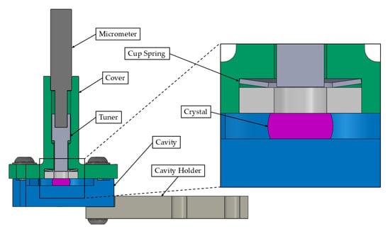 To ensure contact between the crystal and the spring plate, the recess of the cavity supporting the cover component is reduced by at least the height tolerance of the crystal. This adjustment allows the spring plate to deform during bolt tightening in the assembly process at room temperature, such that it is in contact with the crystal before fully engaging with the contact surface of the cavity component. Thermal and mechanical analyses were conducted to evaluate the effects of thermal deformations on the stress state of the crystal. A schematic view of the model is shown in Figure 3.