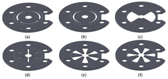 Proposed designs of the spring plate: (a) three circumferential slots; (b) two circumferential slots; (c) two radial holes; (d) six radial holes; (e) six radial enlarged holes; (f) six radial enlarged holes rotated by 30°.