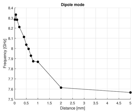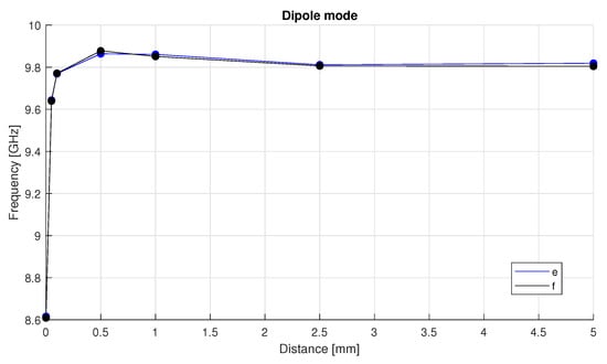To further refine the selection, electromagnetic field simulations were performed for both versions, “e” and “f”. The results, presented in Figure 4, show that both versions exhibit a similar trend in resonance frequency as a function of the tuner’s distance from the crystal.