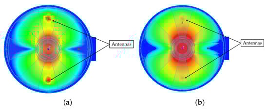 Electric field distribution of the dipole mode within the cavity volume: (a) refers to the “e” version, while (b) corresponds to the “f” version.