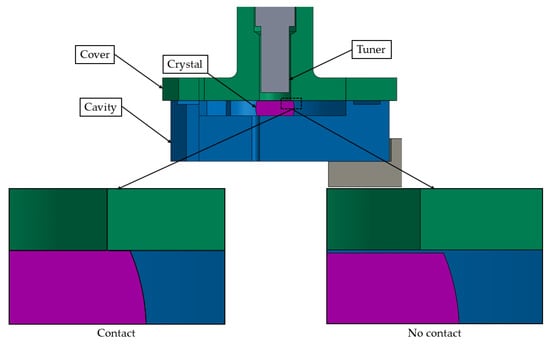 Initially, a tolerance analysis was performed to evaluate the impact of dimensional variations in the crystal on the temperature distribution for the preliminary design, excluding the spring plate. Two configurations were considered: one with contact and one without contact between the crystal and the cover. These configurations correspond to the maximum and minimum crystal height within the fabrication tolerance range, as shown in Figure 7. In the non-contact condition, the gap between the crystal and the cover is approximately 40 µm.