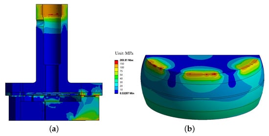 The introduction of a compliant plate mitigates these stresses by reducing contact rigidity and stress levels in the crystal. The stress distribution in the enhanced design is shown in Figure 11, which includes (a) a full view of the device and (b) a detailed view of the crystal, where the equivalent maximum stress in the crystal reaches 203.81 MPa.