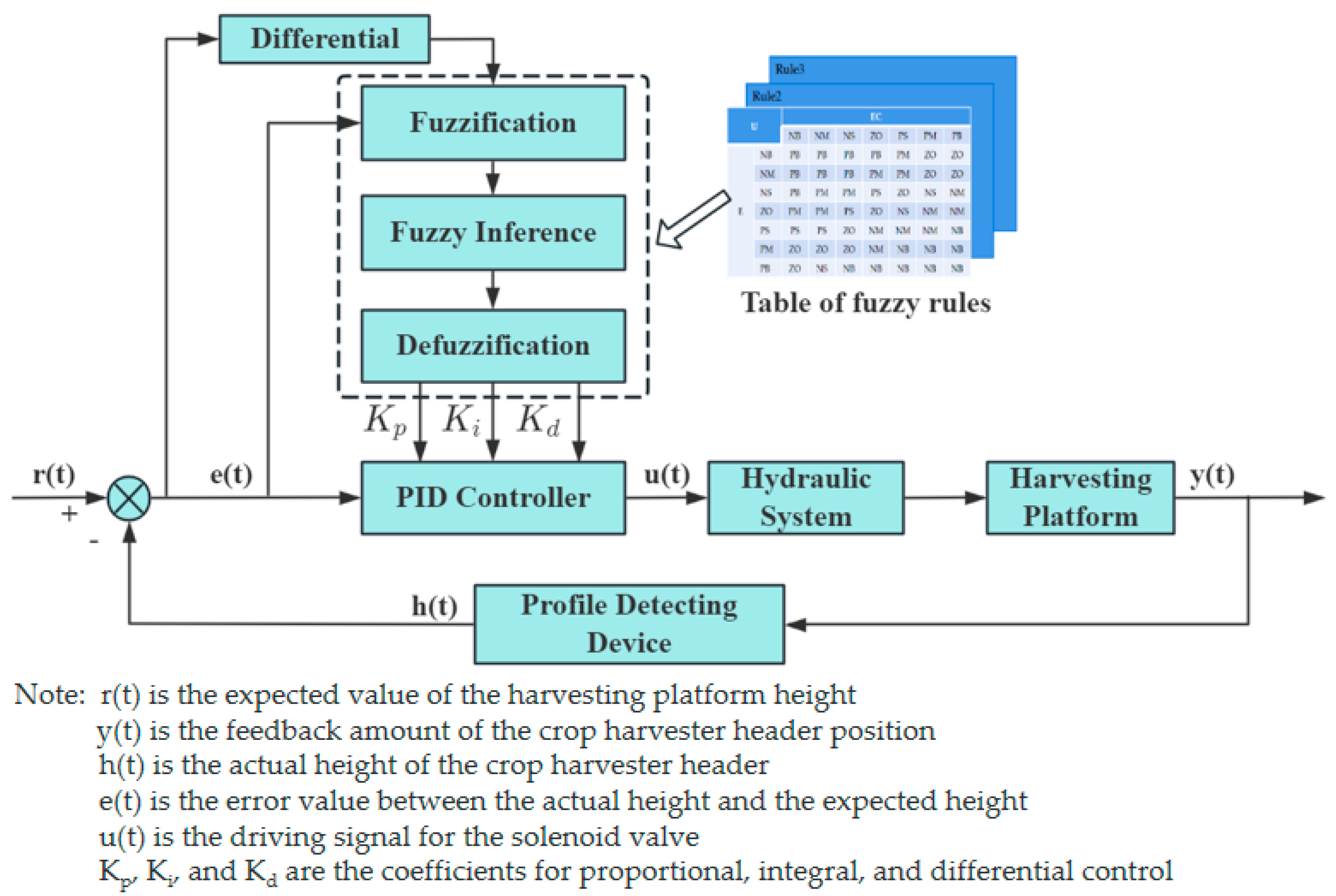 - Zheng, J.; Wang, X.; Huang, X.; Shi, Y.; Zhang, X.; Wang, Y.; Wang, D.; Wang, J.; Zhang, J. Adaptive control system of header for cabbage combine harvester based on IPSO-fuzzy PID controller. Comput. Electron. Agric. 2025, 232, 110044. [Google Scholar] [CrossRef]