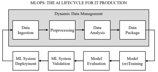 As machine learning becomes increasingly integrated into real-world services, robust data management across the entire data lifecycle has become pivotal. The management of preprocessing tasks like data exploration, cleansing, and labeling directly influences model performance and stability [21,22]. MLOps frameworks address this by leveraging automated pipelines to manage evolving data, as illustrated in Figure 2. These pipelines are designed to handle incoming data efficiently by reducing inter-dataset dependencies and discarding redundant information [23], which has been empirically shown to mitigate data drift and stabilize model performance [24].
