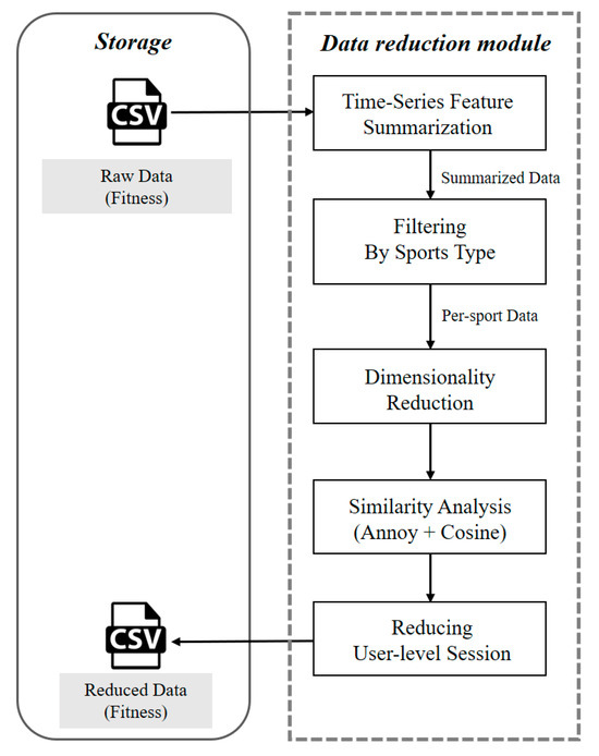 The Data Reduction Module Workflow. The five-stage pipeline transforms raw time-series exercise data into a condensed, optimized dataset. The process involves (1) feature summarization, (2) filtering by sports type, (3) dimensionality reduction, (4) similarity analysis, and (5) user-level session reduction. This approach is designed to enhance computational efficiency while preserving essential user behavior patterns.