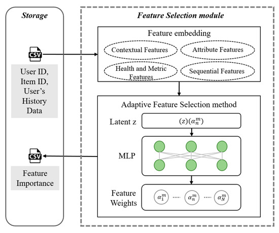 - Lin, W.; Zhao, X.; Wang, Y.; Xu, T.; Wu, X. AdaFS: Adaptive feature selection in deep recommender system. In Proceedings of the 28th ACM SIGKDD Conference on Knowledge Discovery and Data Mining, Washington, DC, USA, 14–18 August 2022. [Google Scholar]