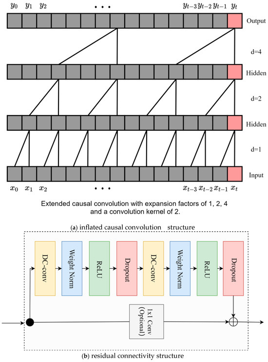 The TCN is a neural network architecture designed using inflated causal convolution. The construction of the subsequent point prediction model will be based on the TCN model for structural reconfiguration, which can significantly reduce the number of parameters of the model, and the implementation of its most core structure includes the inflated causal convolution and residual connectivity structure, as shown in Figure 1a,b.