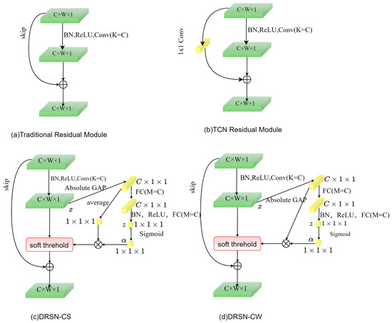 The traditional residual structure is shown in Figure 2a,b, while Figure 2c,d show two variants of the DRSN, i.e., deep residual shared shrinkage network with channel-shared thresholds (DRSN-CS) and deep residual point-by-point shrinkage network (deep residual shrinkage network with channel-wise thresholds, DRSN-CW). Compared with the DRSN-CS module, the threshold obtained by the DRSN-CW residual module is a vector, i.e., each channel corresponds to a shrinkage threshold, so the DRSN method adopted in this paper defaults to DRSN-CW. In contrast to the traditional residual module, the DRSN adds a soft threshold and attention mechanism to the traditional structure.