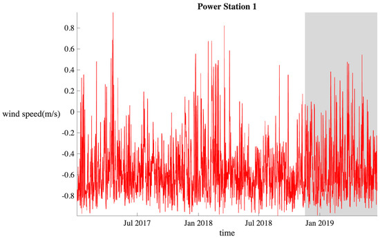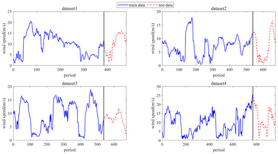 To assess the effectiveness of the proposed method STiCDRS in this paper, this experiment studies four datasets from the wind farm in Inner Mongolia, China, from 20 March 2016 to 19 May 2016, each with a wind speed data step of 15 min [30], which corresponds to datasets 1, 2, 3, and 4, respectively. The first 8 cycle points are used as inputs to predict the current point. The training and testing set division of the dataset is shown in Figure 8.