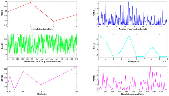 Specifically, Figure 9 shows the loss function values of the baseline model when optimizing individual hyper-parameters during Bayesian optimization. It is clear that the loss function value is minimized when the convolution kernel size is 3, the convolution kernel size is 31, the learning rate is 0.003, and the L2 regularization coefficient is 0.93. Although the minimum loss value corresponding to the number of hidden units in the fully connected layer is not obvious, a comparison of specific values shows that the loss function value performs best when the number of hidden units is 119.