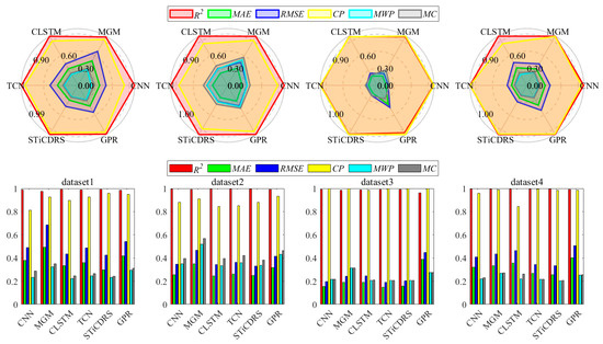 The radar and bar charts in Figure 11 illustrate the evaluation metrics for all model point and interval prediction results across four datasets. The radar charts clearly show that the STiCDRS model outperforms the other models in six key metrics. Notably, for the forward metrics R2 and CP, the STiCDRS model achieves the largest radius, nearing the optimal value of 0.99, indicating its superior prediction capability.