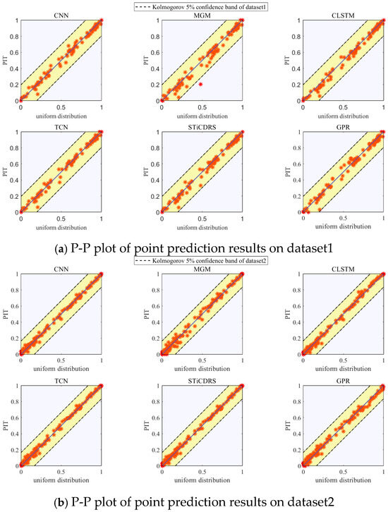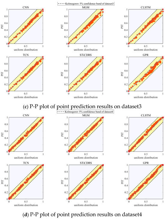 Here, denotes the corresponding point prediction, where can usually be shown by a P-P plot, i.e., plotting the CDF of the PIT against the CDF of a standard uniform distribution. The P-P plot plotted is closer to a straight line when the prediction is more accurate.