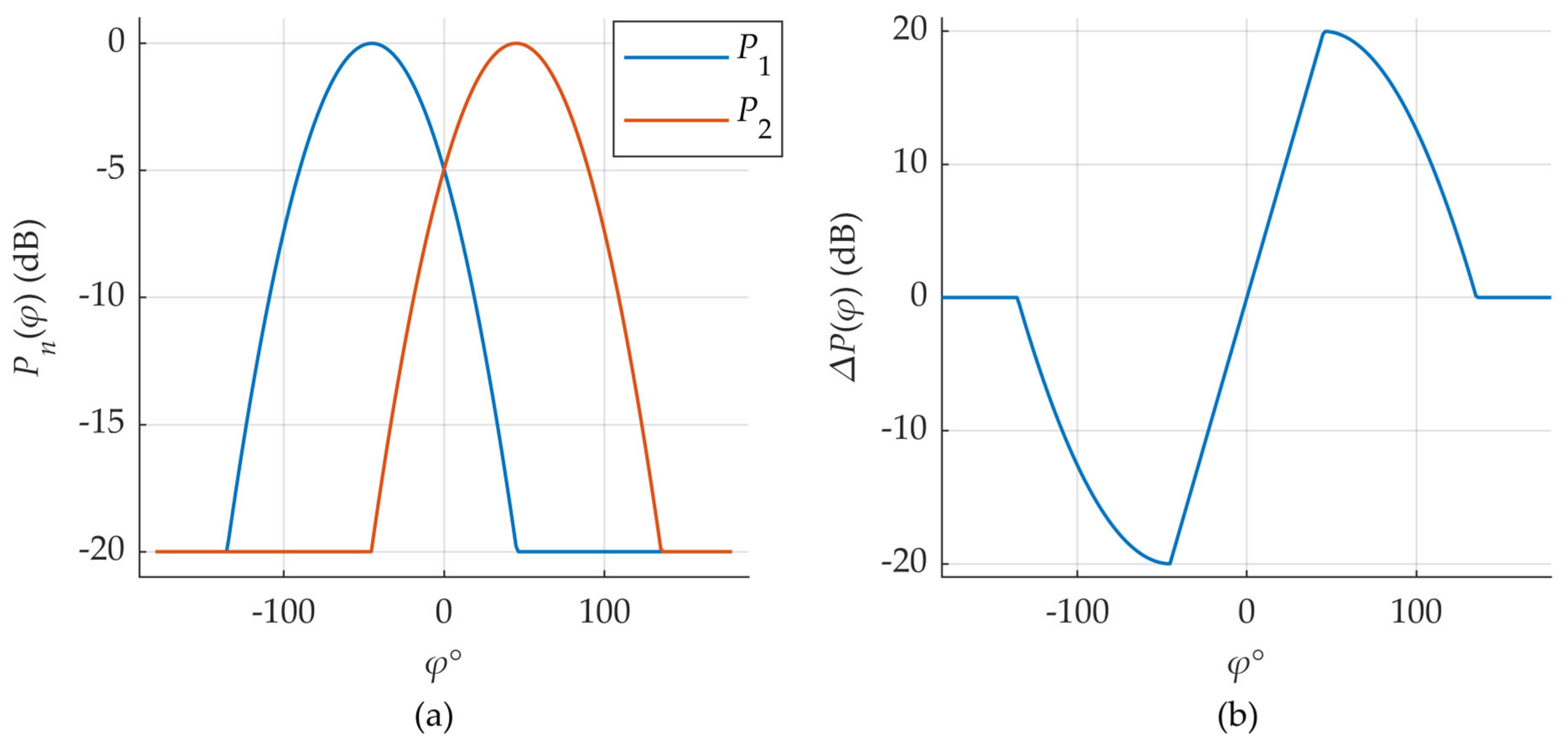 φn, a given signal strength may correspond to two distinct azimuth angles. This ambiguity can be resolved by introducing a second beam oriented in a different direction. An illustrative configuration is shown in