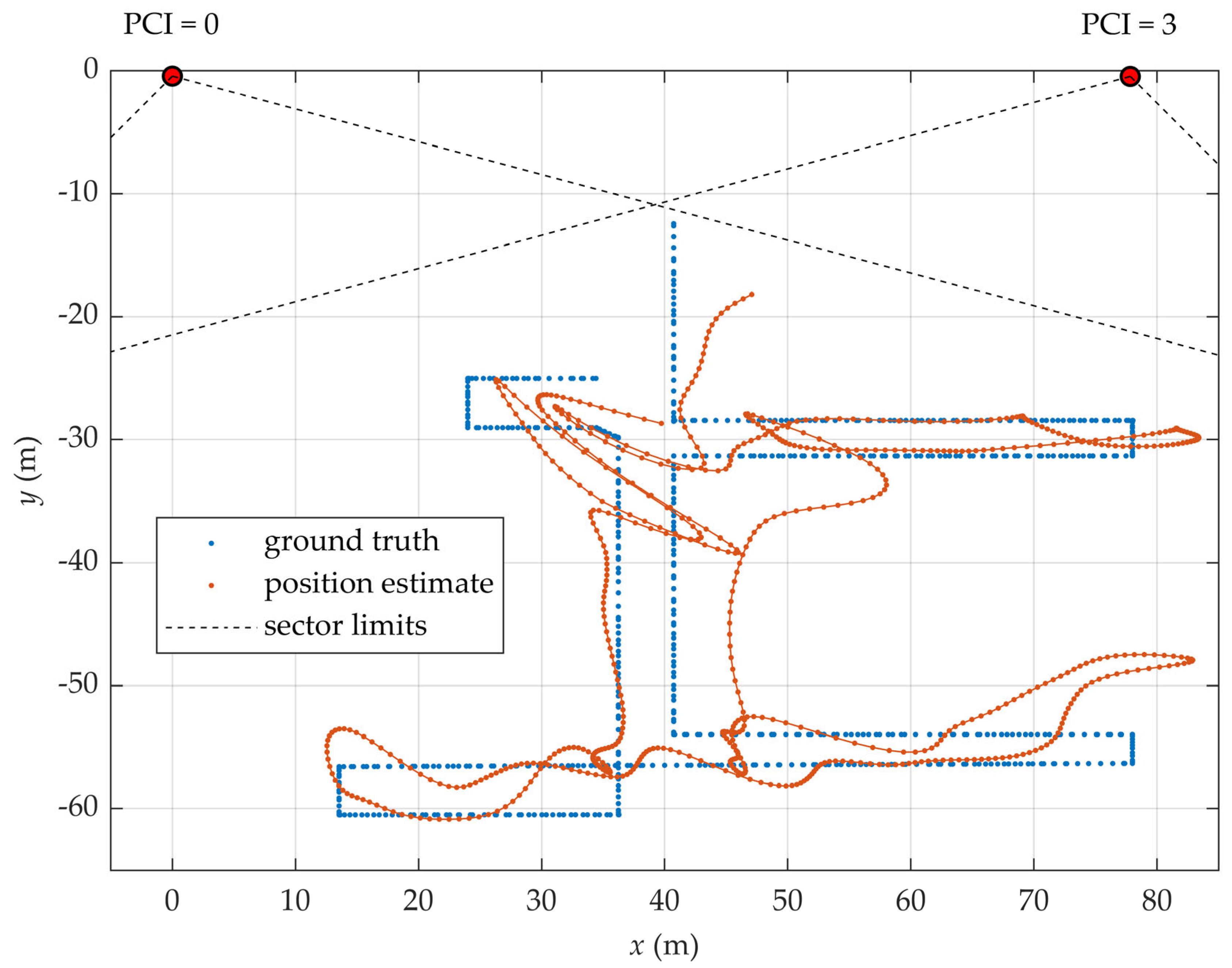 Table 2. The first row shows the results obtained using raw DL-AoD estimates for triangulation, while the second row presents improvements resulting from outlier removal and trajectory smoothing. The trajectory that is shown in