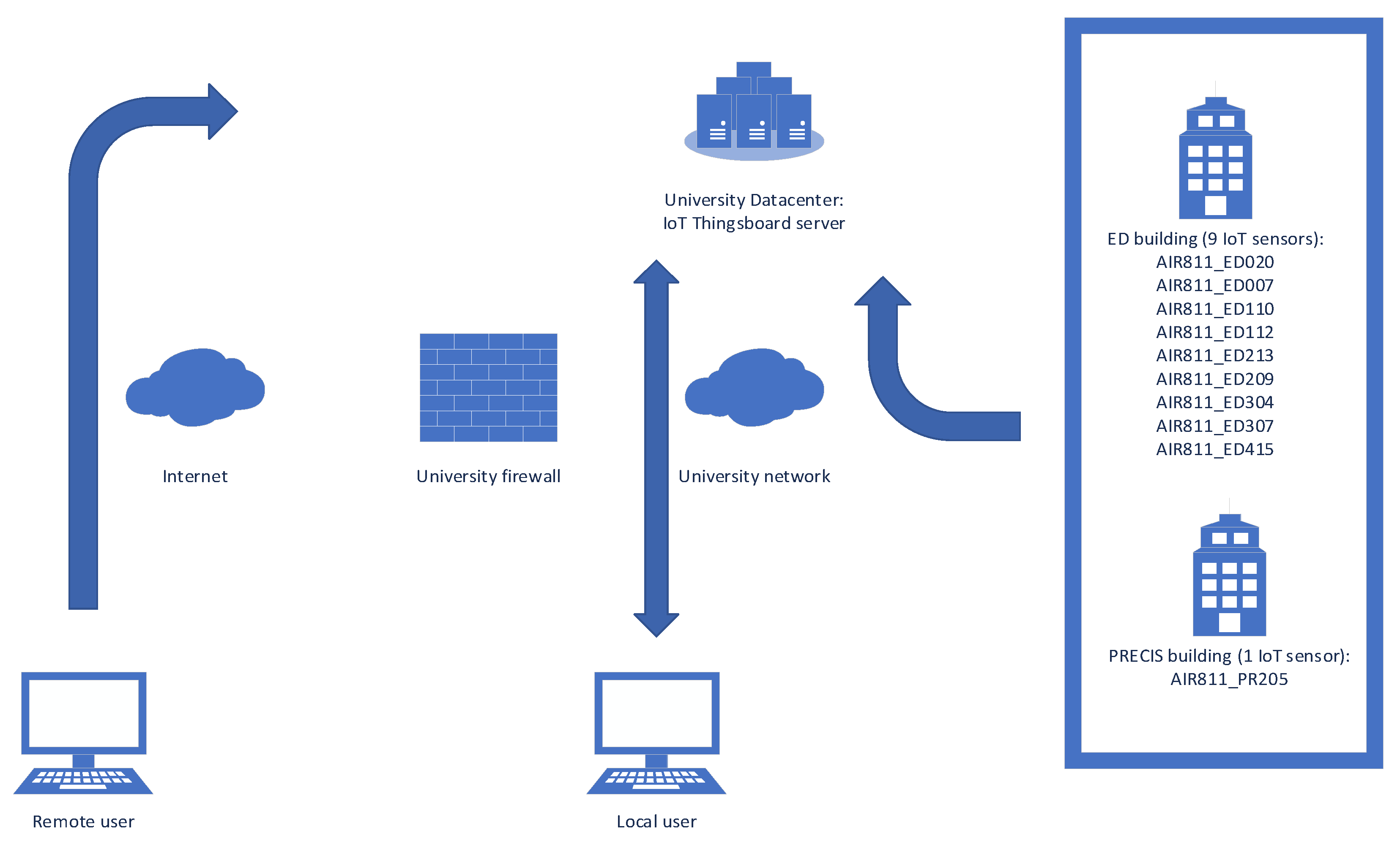 - Bidilă, T.; Pietraru, R.N.; Ionita, A.D.; Olteanu, A. Monitor Indoor Air Quality to Assess the Risk of COVID-19 Transmission. In Proceedings of the 2021 23rd International Conference on Control Systems and Computer Science (CSCS), Bucharest, Romania, 21–28 May 2021; pp. 356–361. [Google Scholar]
