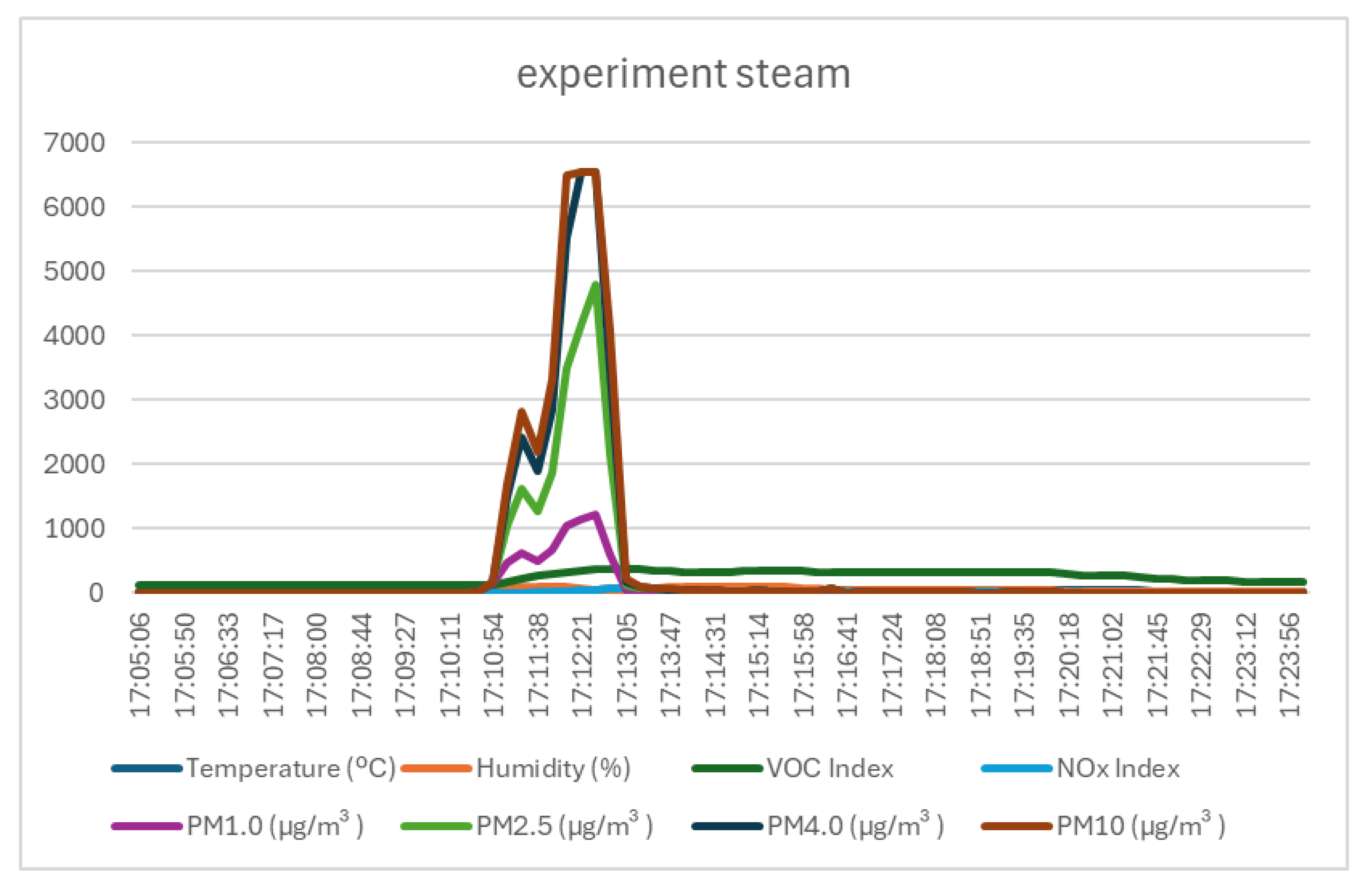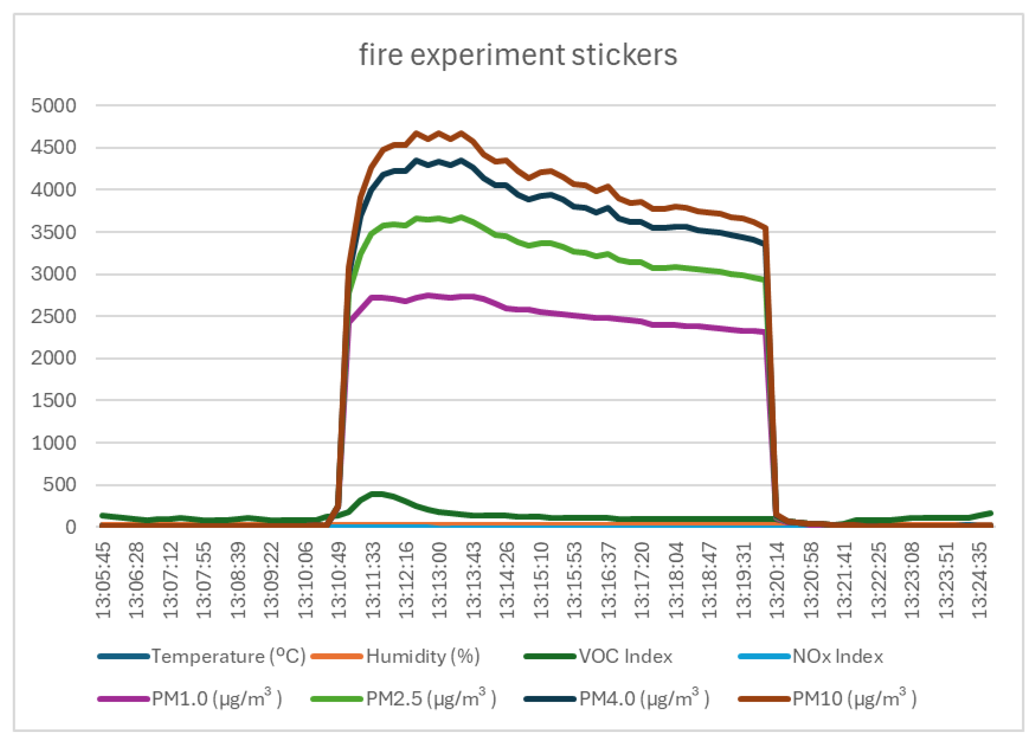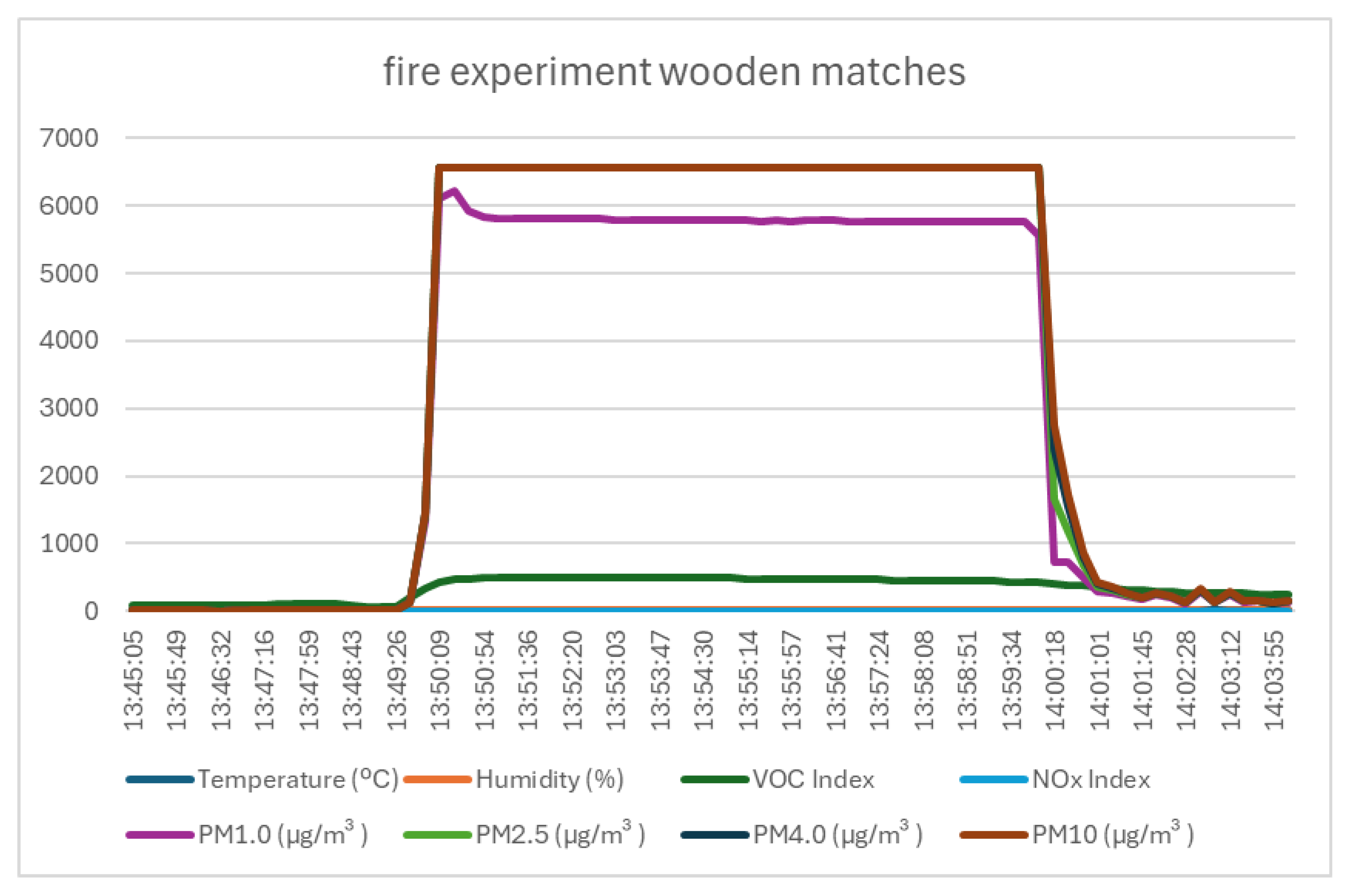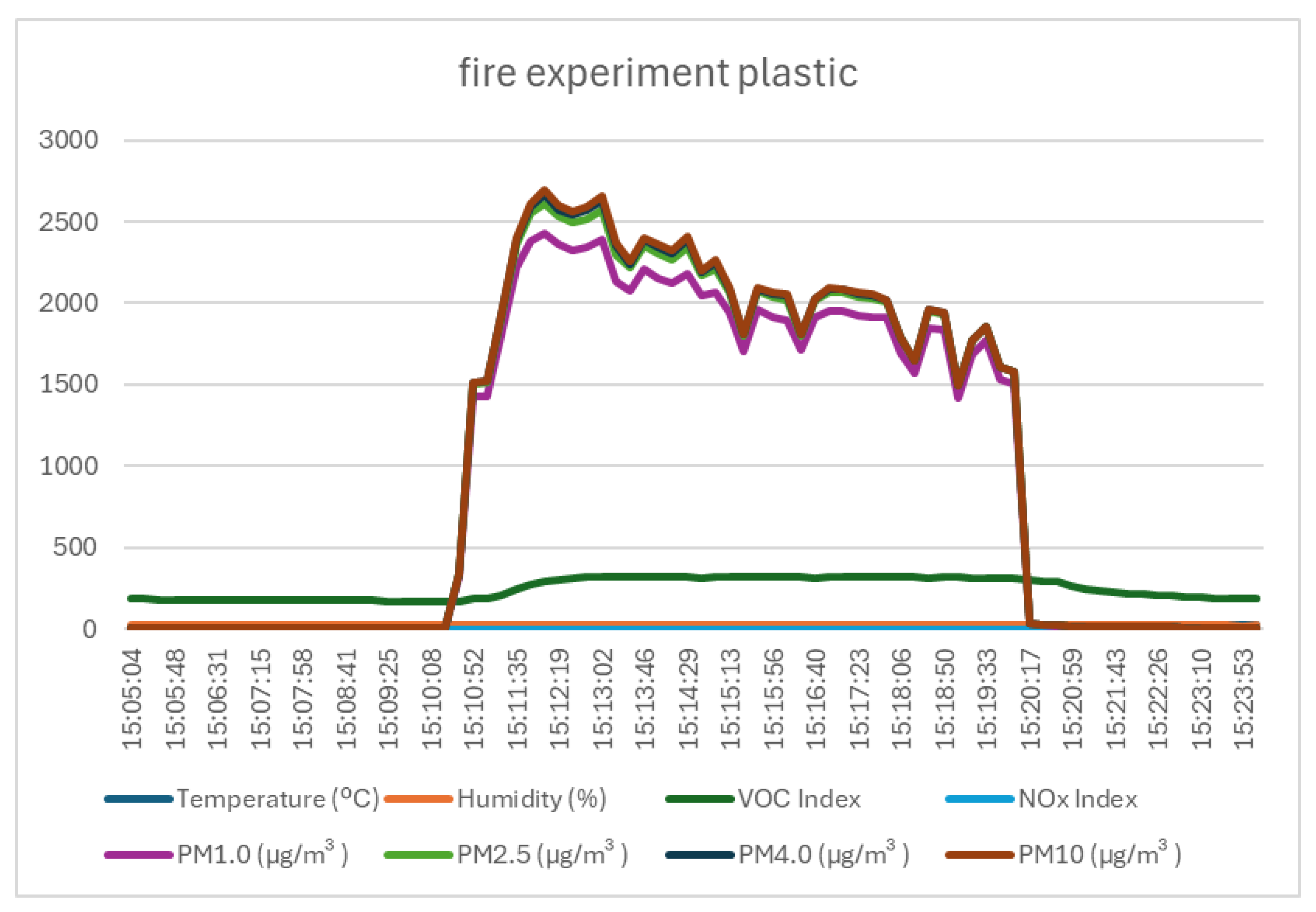 - Early detection situation of a fire, characterized by a strong increase in the dust concentration (over 2000 µg/m3 regardless of particle size PM1.0, PM2.5, PM4.0, or PM10) simultaneously with a strong increase in another air quality parameter (in the case of the present research, the VOC index increased by over 150 units, but it is possible that in the case of burning materials with higher calorific values or containing hydrocarbons, it could also be the NOx index).