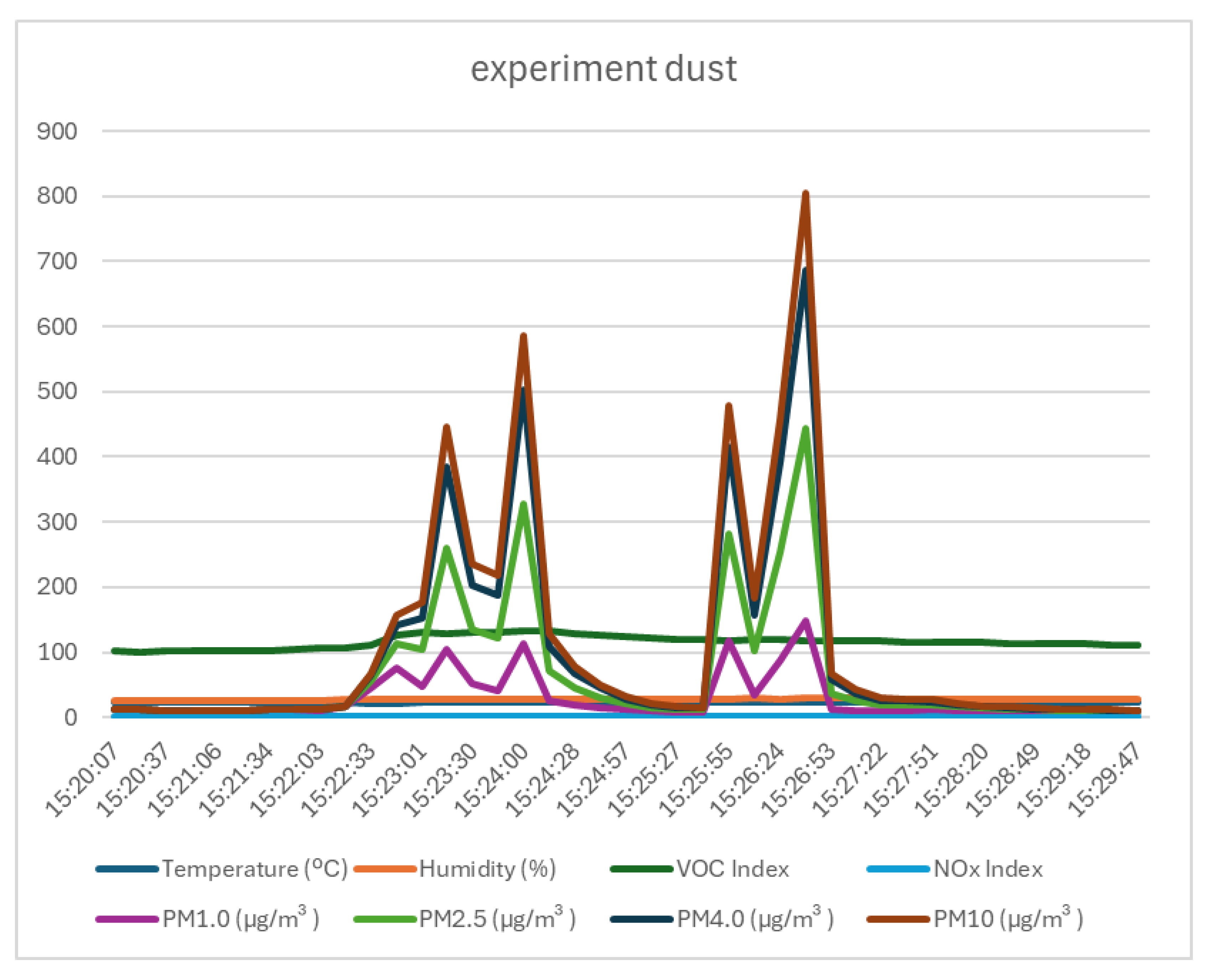 - The sensor indicates a dangerous situation for human health, but not a fire. In this case, the value of one of the air quality parameters is above normal values (as was the case for the dust concentration in the last test), but its increase is large only in relation to indoor air quality standards and not to the sensor’s measurement range (the test carried out indicated an increase of 150–700 µg/m3 in the dust concentration for the various particle sizes).